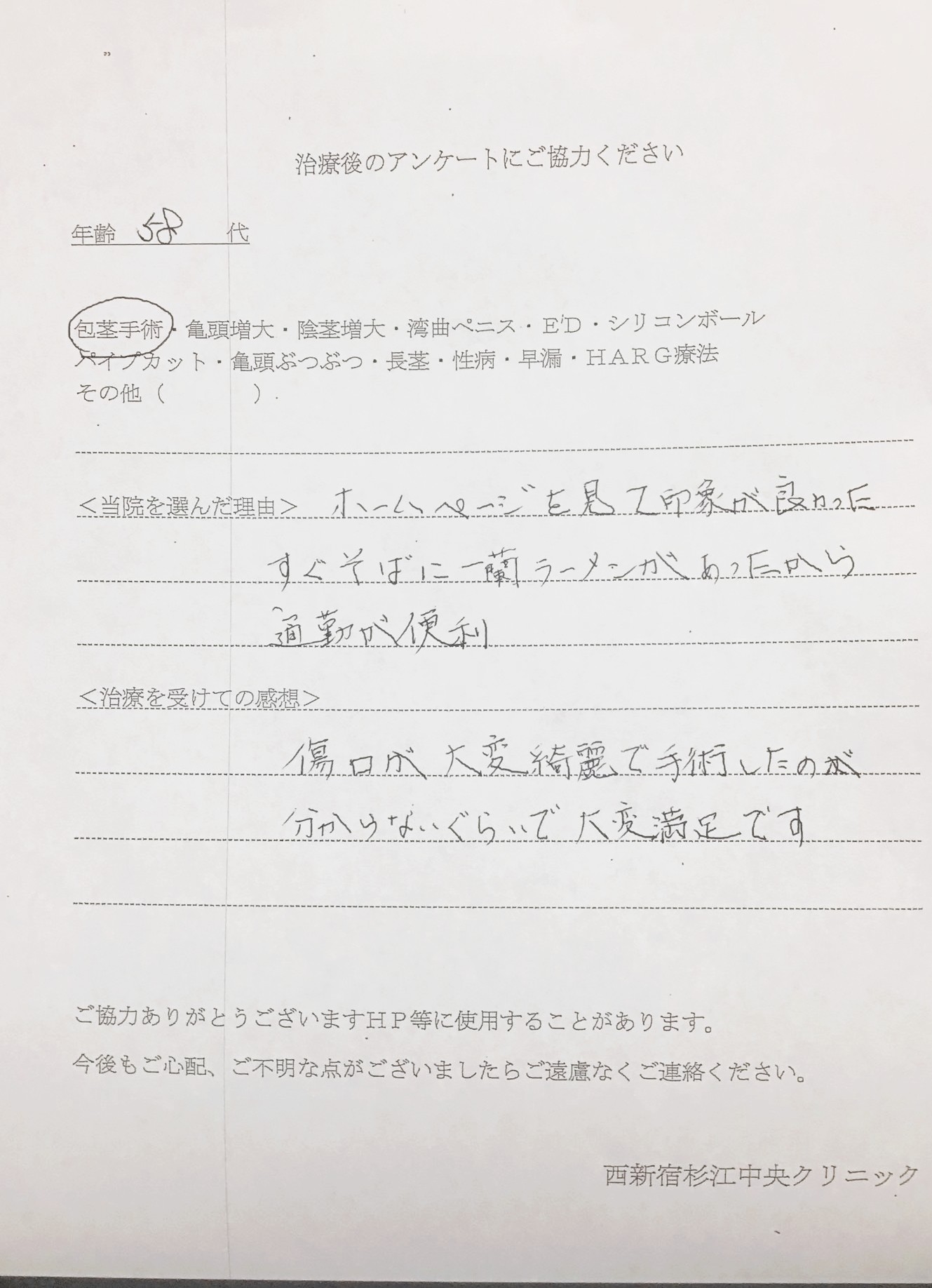 包茎手術後のクチコミアンケートを頂けましたので、